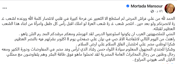 وعبر منصة فيسبوك، دون مرتضى منصور قائلا: أتمني للمتصهينين العرب ان يكونوا استوعبوا الدرس لقد انهزمتم ومعكم مرشدكم المجـ رم النتنياهو ، راهنت من اليوم التالي لانتفاضة الاقصي في بيان علي صفحتي يوم 8 اكتوبر بشرتهم فيه بالنصر العظيم.