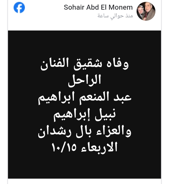 وفاة شقيق الفنان عبد المنعم إبراهيموكتبت زوجة الفنان صبري عبد المنعم منشورًا قالت فيه: "وفاة شقيق الفنان الراحل عبد المنعم إبراهيم، الأستاذ نبيل إبراهيم، والعزاء يوم الأربعاء المقبل بآل رشدان."