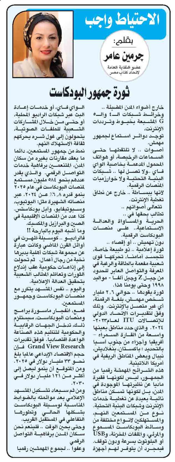 فمع، انفجار ماسورة برامج ومنصات البودكاست، سيستلزم ذلك، تدخل الجهات الرقابية والحكومية لتنظيم هذه الصناعة الواعدة اقتصاديا. فوفق تقديراتGrand View Research فإن حجم الاقتصاد الإبداعي عالميا بلغ نحو 33 مليار دولار في 2025. ومن المتوقع أن ينمو ليصل إلى أكثر من 121 مليار دولار في 2030.