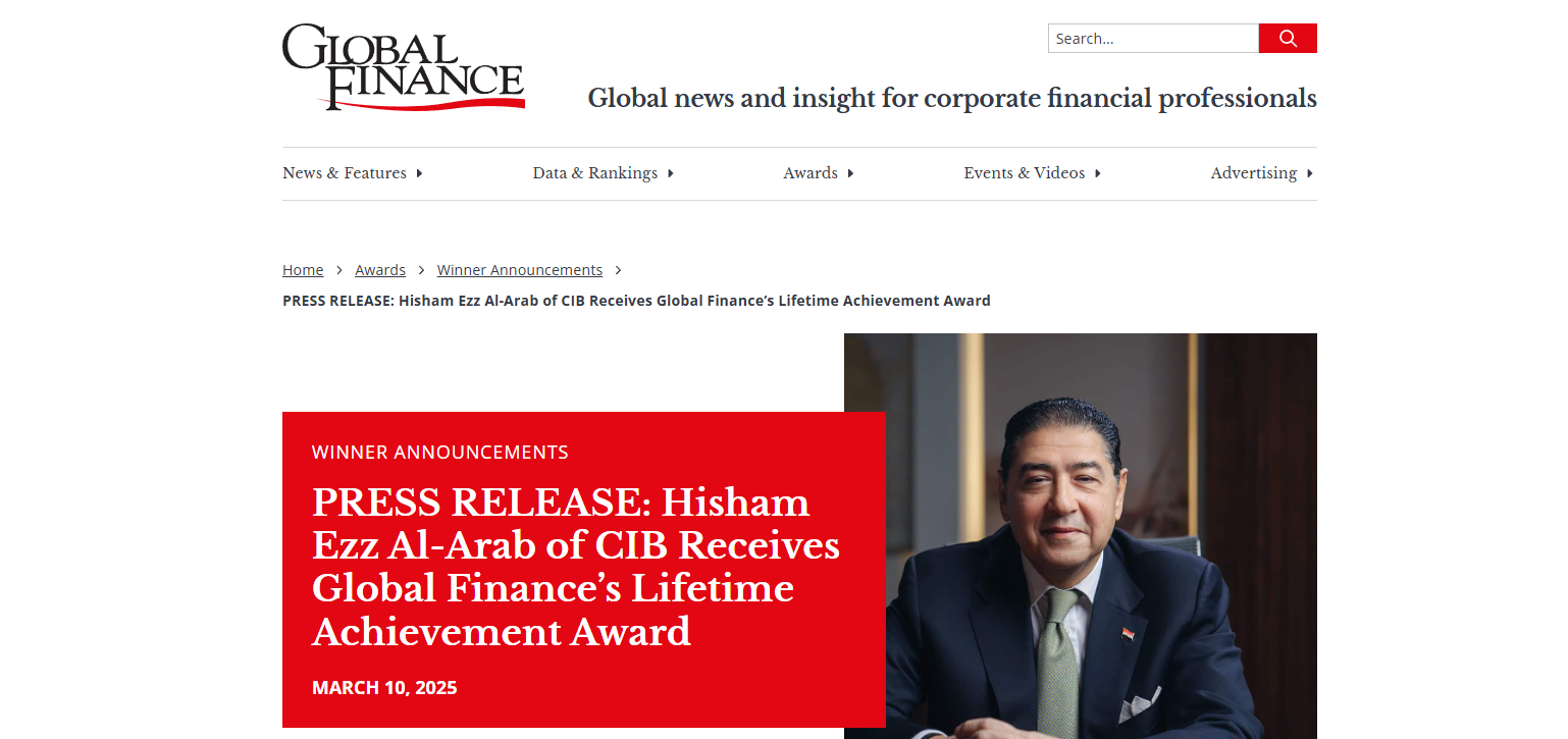 كرّمت مجلة Global Finance هشام عز العرب، الرئيس التنفيذي وعضو مجلس إدارة البنك التجاري الدولي CIB في مصر، بمنحه جائزة الإنجاز مدى الحياة، وهي أعلى وسام فردي تمنحه المجلة.