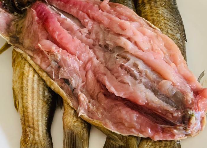 - أزيلي الخياشيم فقط واتركي السمكة كما هي دون فتحها.