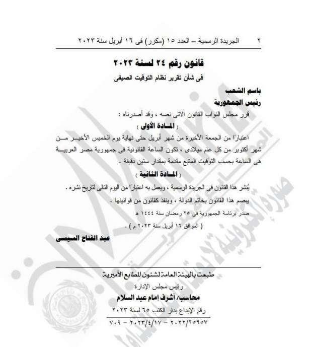 وبموجب القانون رقم 34 لسنة 2023، سيتم تأخير الساعة 60 دقيقة في نهاية يوم الخميس الأخير من شهر أكتوبر، الذي يوافق هذا العام 30 أكتوبر 2025، على أن يبدأ العمل بالتوقيت الجديد اعتبارًا من صباح الجمعة 31 أكتوبر 2025.
