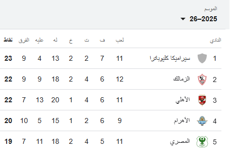 ترتيب أول 5 فرق في جدول الدوري