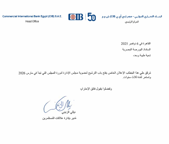 أعلن البنك التجاري الدولي مصر CIB، عن فتح باب الترشح لعضوية مجلس الإدارة لدورة المجلس التي تبدأ في مارس 2026 وتستمر لمدة ثلاث سنوات وذلك إعمالاً للقانون.