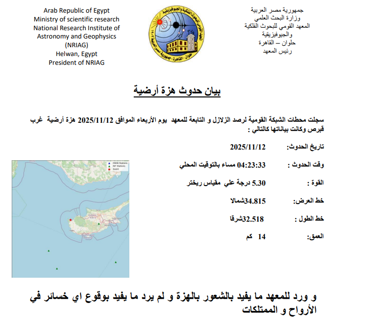 أعلن المعهد القومي للبحوث الفلكية والجيوفيزيقية أن محطات الشبكة القومية لرصد الزلازل سجلت اليوم الأربعاء الموافق 12 نوفمبر 2025، هزة أرضية غرب قبرص في تمام الساعة 04:23:33 مساءً بالتوقيت المحلي.