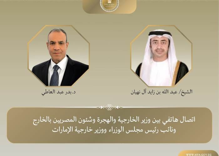 جرى اتصال هاتفي بين بدر عبد العاطي وزير الخارجية والهجرة وشئون المصريين بالخارج، وعبد الله بن زايد آل نهيان نائب رئيس مجلس الوزراء ووزير الخارجية بدولة الإمارات العربية المتحدة، وذلك في إطار التواصل والتنسيق المستمر بين البلدين الشقيقين حول سبل تعزيز العلاقات الثنائية والقضايا الإقليمية ذات الاهتمام المشترك.