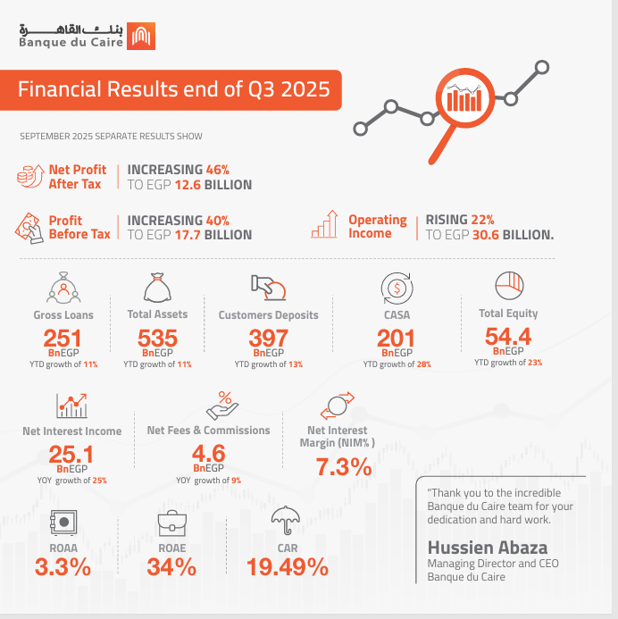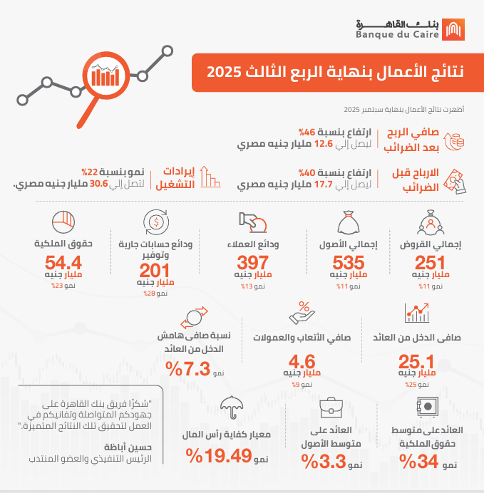 حقق بنك القاهرة أداءاً إيجابيًا خلال التسعة أشهر الأولى من عام 2025، محققاً نموًا في صافي أرباحه بنسبة 46% مقارنة بنفس الفترة من العام الماضي.