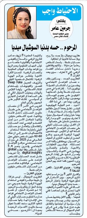 العفريت الديجيتال .. ليس خرافة، بل نتيجة مباشرة لفوضى استخدام الهوية الرقمية، نتيجة عدم وعي، من يملك الحق أن يتكلم باسم المرحوم. إذا لم تتحرك الدول، أو تضع لمنصات التواصل الاجتماعي قواعد صارمة لتنظيم حسابات الموتي أو حتى الإشارة لها، بأنها حسابات لتخليد الذكرى، سنجد أنفسنا نعيش وسط ملايين الأصوات المرحومة بحجة أن : "المرحوم .. حسه في الدنيا".