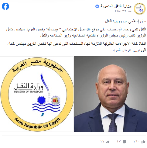 حسمت وزارة النقل الجدل المثار حول وجود حسابات منسوبة للفريق مهندس كامل الوزير نائب رئيس مجلس الوزراء للتنمية الصناعية ووزير الصناعة والنقل على موقع التواصل الاجتماعي «فيسبوك»، مؤكدة عدم امتلاكه أي حساب شخصي على المنصة.