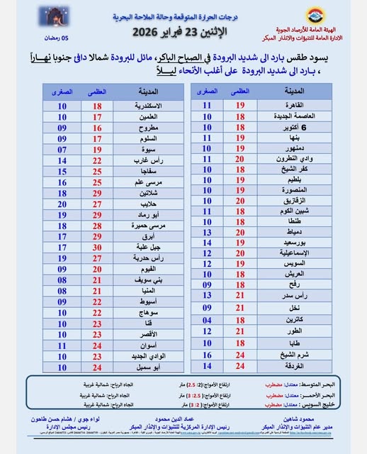 وأشارت إلى تكون شبورة مائية في الصباح على مناطق من شمال البلاد حتى القاهرة الكبرى وشمال الصعيد ومدن القناة ووسط سيناء، وقد تصل إلى حد الكثافة على بعض الطرق، ما يتطلب توخي الحذر أثناء القيادة.