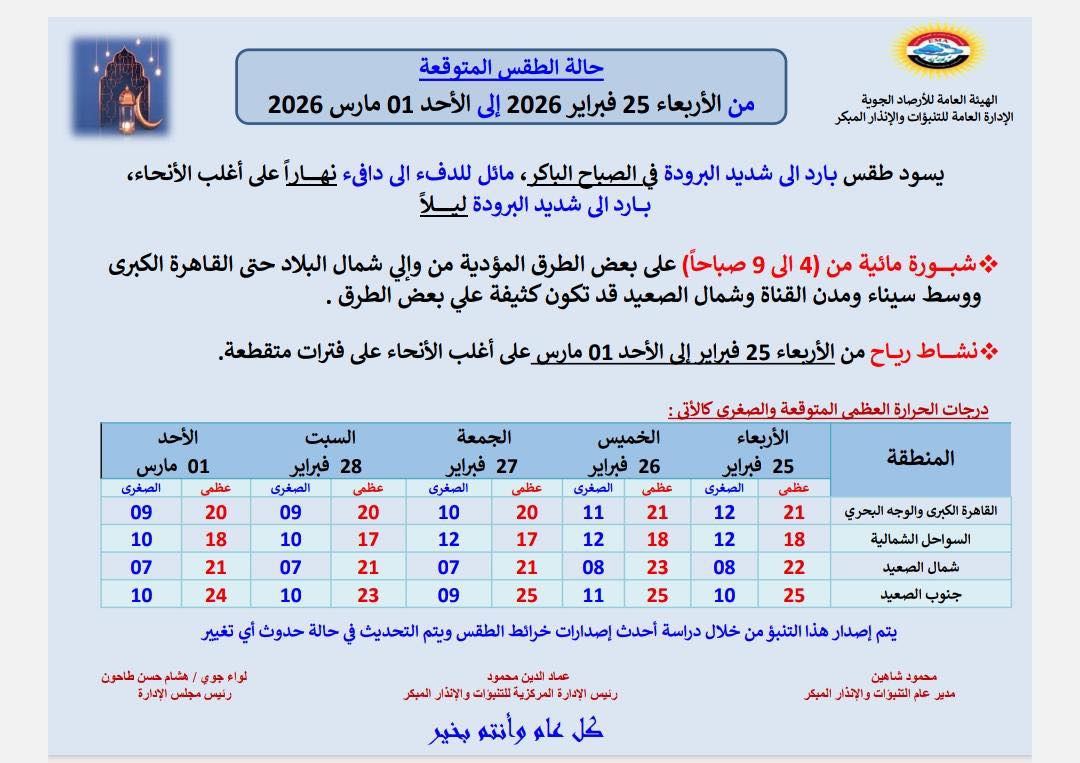 كشفت الهيئة العامة للأرصاد الجوية تفاصيل حالة الطقس المتوقعة خلال الفترة من الأربعاء 25 فبراير وحتى الأحد 1 مارس 2026، مع مؤشرات على تراجع درجات الحرارة ليلًا وعودة الأجواء شديدة البرودة في عدد من المناطق.