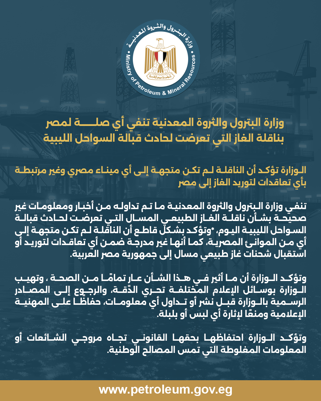 تنفي وزارة البترول والثروة المعدنية ما تم تداوله من أخبار ومعلومات غير صحيحة بشأن ناقلة الغاز الطبيعي المسال التي تعرضت لحادث قبالة السواحل الليبية اليوم، وتؤكد بشكل قاطع أن الناقلة لم تكن متجهة إلى أي من الموانئ المصرية، كما أنها غير مدرجة ضمن أي تعاقدات لتوريد أو استقبال شحنات غاز طبيعي مسال إلى جمهورية مصر العربية.