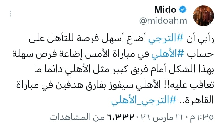 وكتب ميدو عبر حسابه الرسمي على منصة «إكس» أن الترجي أهدر فرصة كانت الأسهل لحسم التأهل على حساب الأهلي خلال مواجهة الذهاب، موضحًا أن إهدار الفرص السهلة أمام فريق بحجم الأهلي غالبًا ما يكون له ثمن في المباريات الحاسمة.