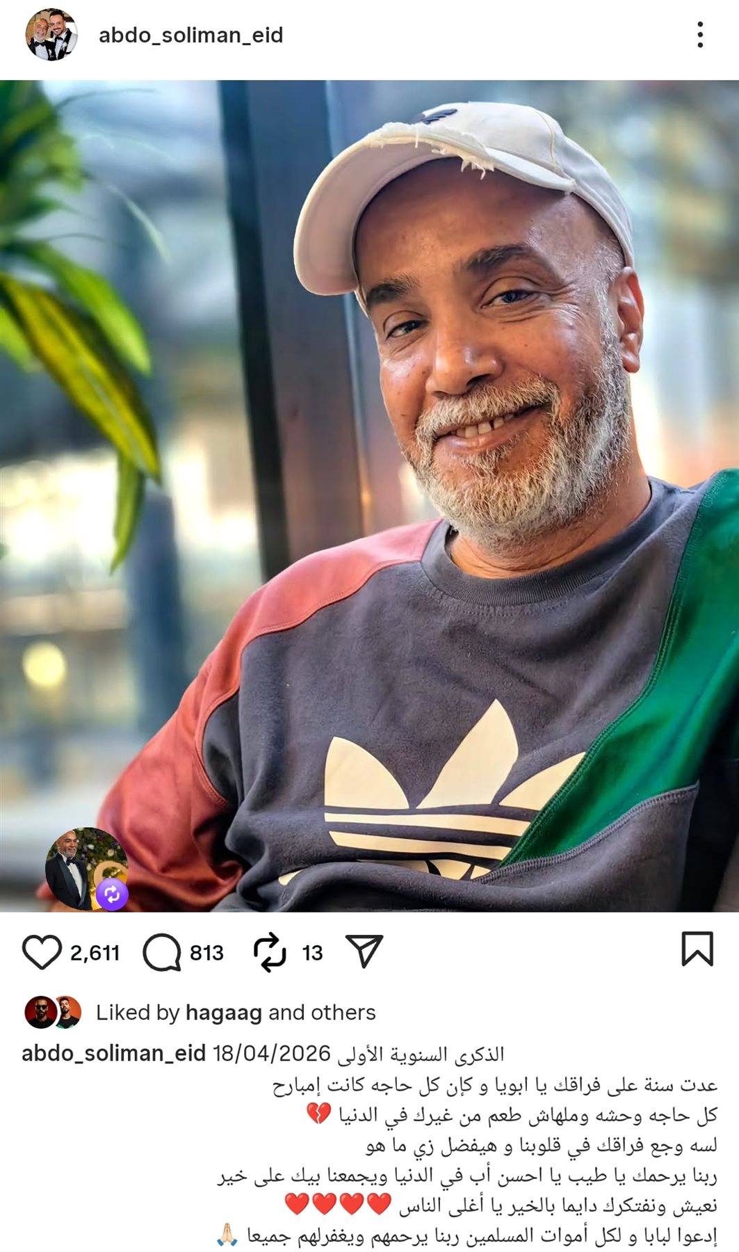 أحيا عبده، نجل الفنان الراحل سليمان عيد، الذكرى الأولى لوفاة والده التي توافق اليوم السبت 18 أبريل 2026، بكلمات مؤثرة عبّر خلالها عن حزنه واشتياقه الكبير له.